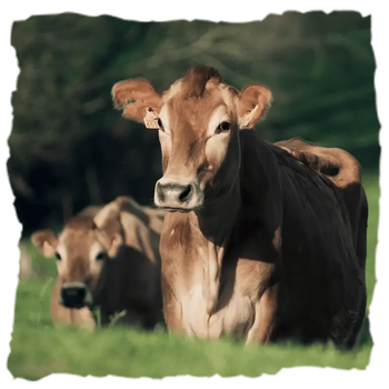 Las vacas de raza Jersey son una especie vacuna de pelaje marrón y carácter dócil. Son reconocidas por la alta calidad de su leche, tanto en grasa como en proteína. Pueden alcanzar un peso de hasta 450 kilos y producen aproximadamente 14 kilos de leche al día. Criadas especialmente para el pastoreo, se alimentan casi todo el año de hierba fresca, hierba seca y cereales, evitando los ensilados. Esto contribuye a la obtención de una leche única para la elaboración de sus quesos.