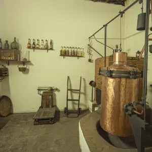 Después de pasar por la fermentación, los orujos son destilados en alambique de cobre a fuego lento para obtener el grado alcohólico ideal de la uva.