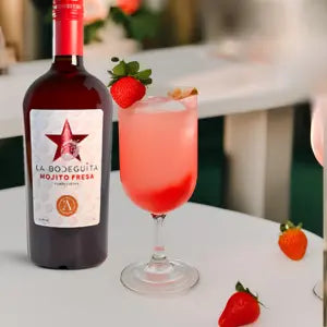 El Mojito Fresa La Bodeguita, elaborado artesanalmente con las mejores materias primas sobre una base de ron dorado mediterráneo de elaboración propia, selección de fresas nacionales, menta del norte de África, selección de limas y limones y azúcar de caña procedente de Sudamérica, mezclados artesanalmente para sacar lo mejor de cada producto sin procesos artificiales.