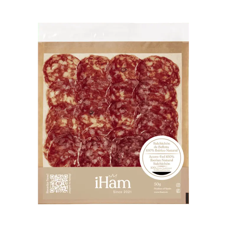 - 2 sobres salchichón de bellota 100% ibérico natural de iHam de 50 g.