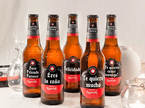 Las etiquetas personalizadas de Estrella Galicia son vinilos adhesivos de alta calidad. Se pueden mojar y son anti-arañazos